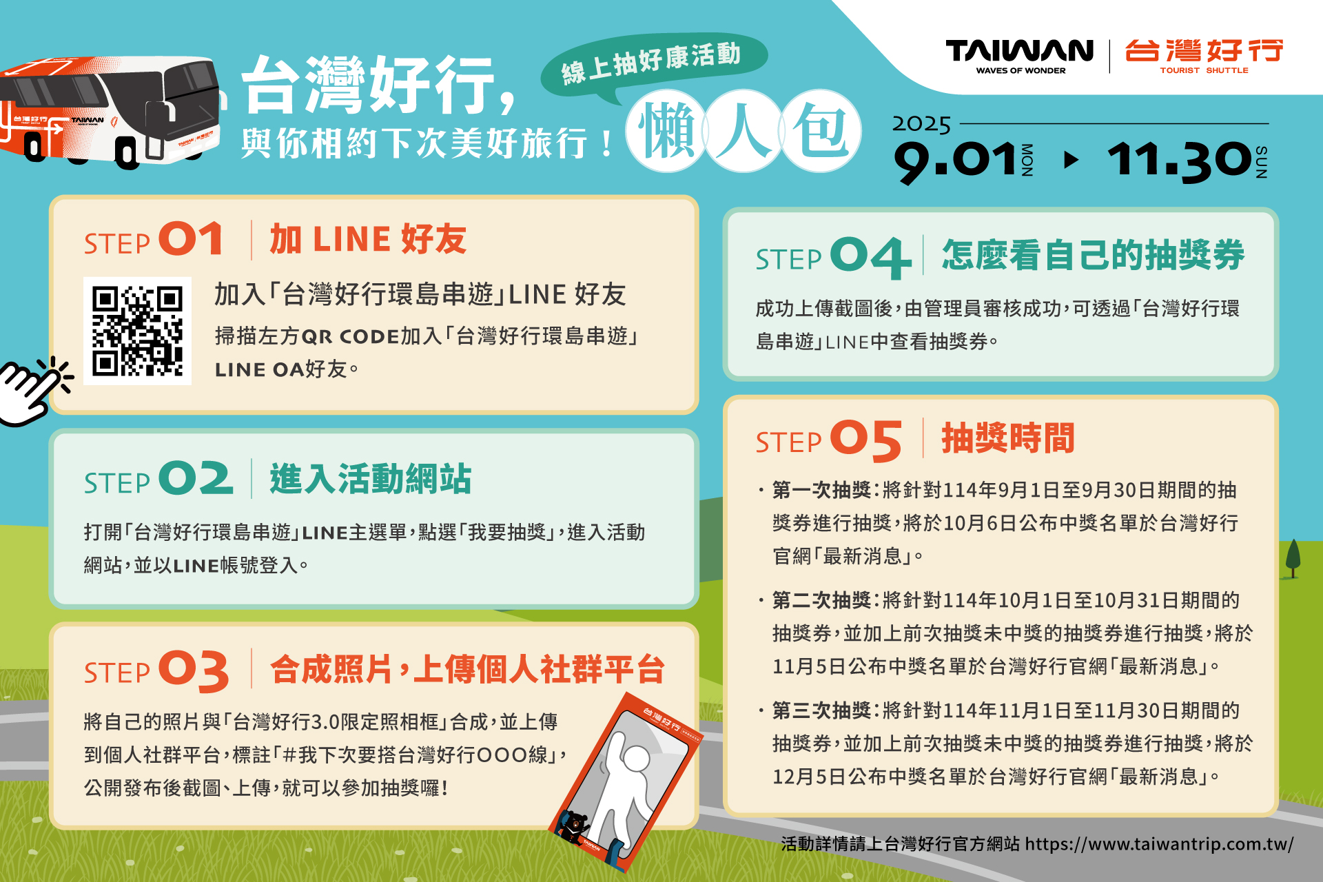 1. 第一次抽獎:將針對114年9月1日至9月30日期間符合資格者進行抽獎,將於10月6日公布中獎名單於台灣好行官網「最新消息」。
