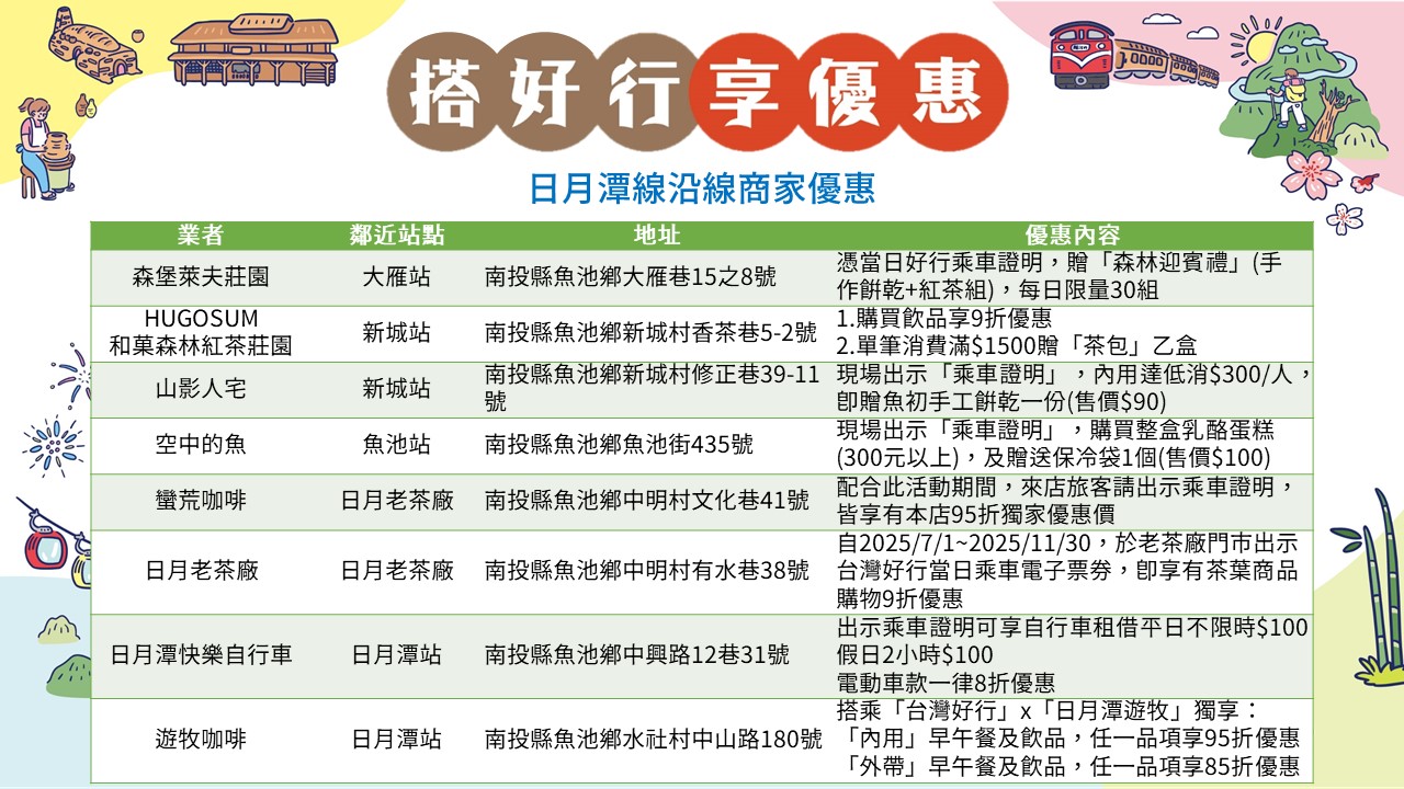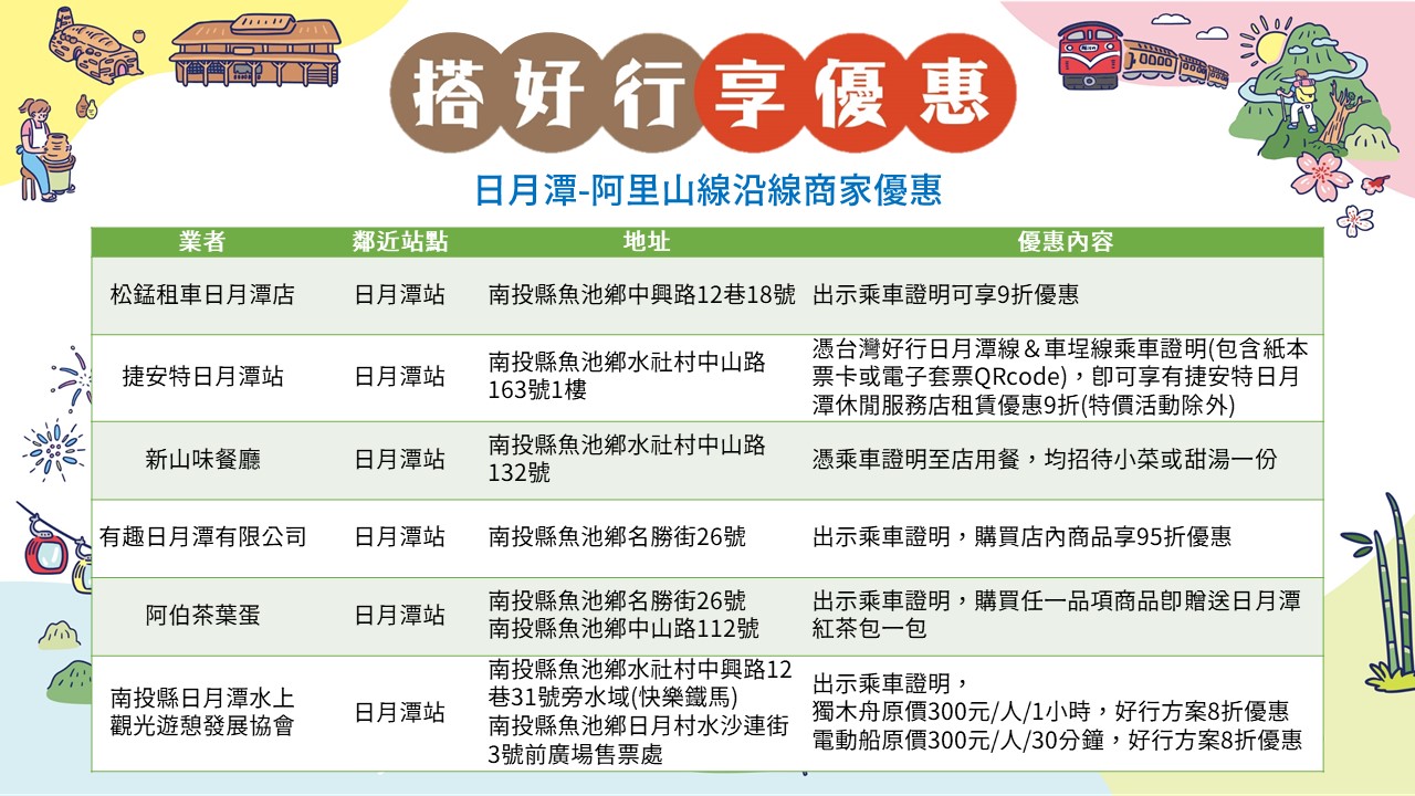 優惠1:使用電子票證搭乘台灣好行日月潭線、車埕線或日月潭阿里山線,即享半價優惠(即日起至2025年10月31日止)